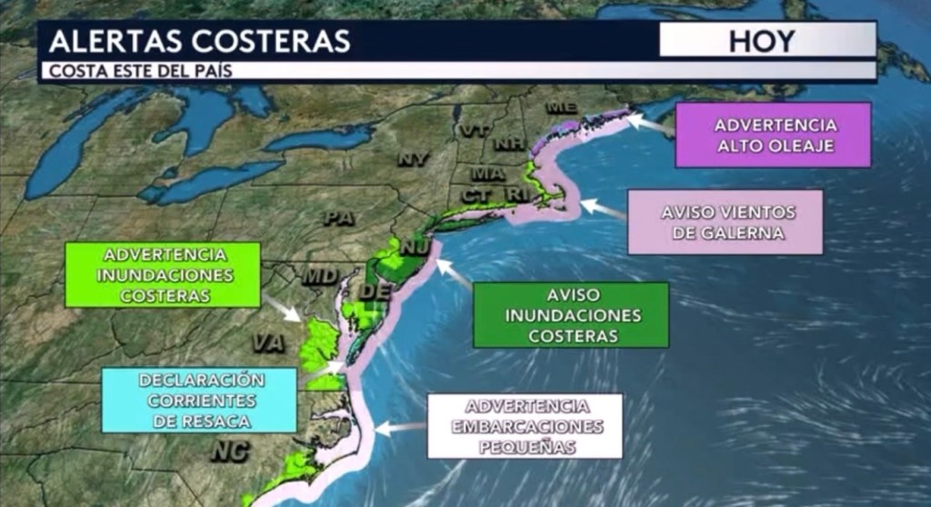 •Habrán varias alertas costeras en vigor para la jornada de hoy para los costas del Atlántico Medio y Nueva Inglaterra, ya sea por las inundaciones costeras, el alto oleaje, las corrientes de resaca o los fuertes vientos marinos de fuerza de galerna (más de 35 nudos o 39 mph). No es un buen día para estar en la playa o incluso cerca de la costa.