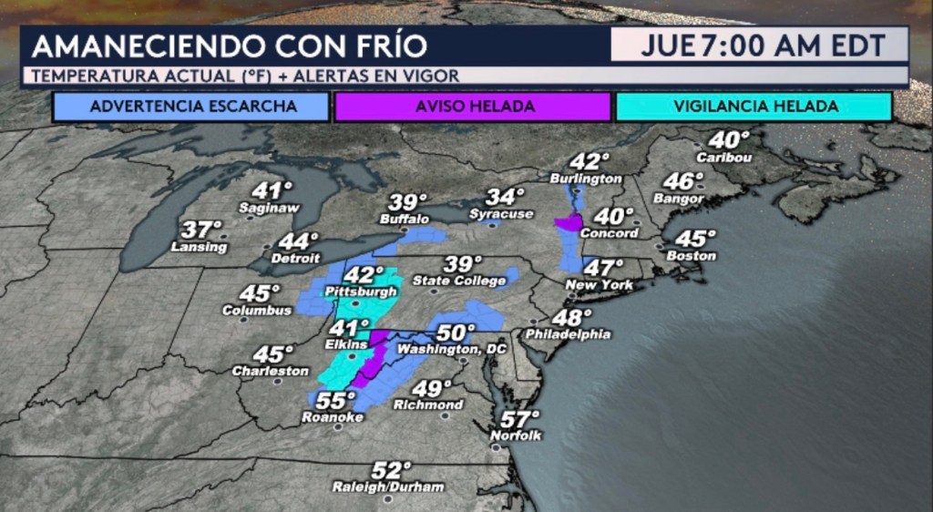 •Las temperaturas actuales son más frías que las de ayer tras el paso de un frente frío, generalmente en el rango de los 40°F. Ciudades como Nueva York, Detroit, Boston, Philadelphia y Washington están sintiendo esta masa de aire más fría para comenzar el día.