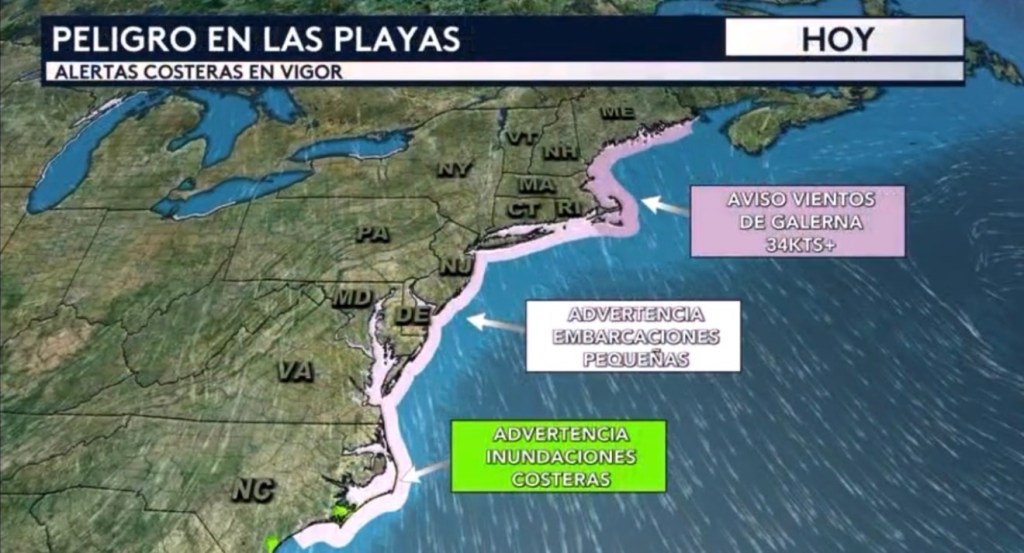 •Estos fuertes vientos estarán provocando condiciones marítimas peligrosas a lo largo de las costas del Atlántico Medio y Nueva Inglaterra para la jornada de hoy. Hay avisos por vientos marítimos de galerna (34 nudos +), advertencias por embarcaciones pequeñas y advertencias por inundaciones costeras en vigor desde las Carolinas hasta el Golfo de Maine. No será un día ideal para visitar las playas ni para estar en tu barco.