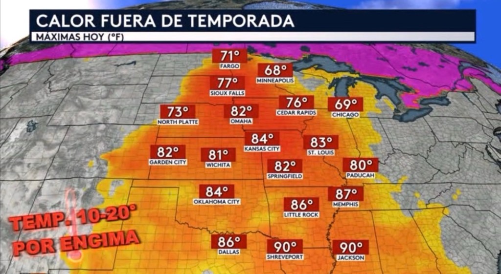 •Se espera un calor fuerte de temporada para las Gran Planicies y Valle de Mississippi, donde las temperaturas máximas esta tarde serán de entre 10 a 20°F por encima del promedio para esta época del año. Incluye lugares como Kansas City, St. Louis, Oklahoma City, Little Rock y Memphis.