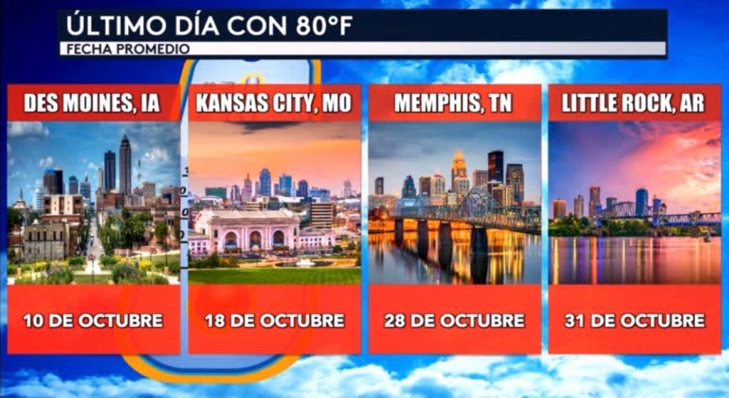 •Algunas de estas ciudades, como Des Moines, ya no deben estar registrando temperaturas en los 80°F. Según la climatología, el último día promedio que se debe registrar una temperatura máxima de 80°F en Des Moines es el 10 de octubre, y estamos hoy en el día 16. El último día con 80°F ya se debe estar registrando dentro de los próximos 2 días en Kansas City. No es sino hasta finales de mes que tanto Memphis como Little Rock experimentan su último día con 80°F en el año calendario.