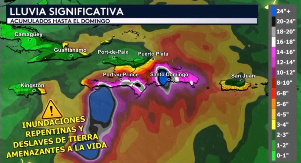 •Nuestro modelo de pronóstico está mostrando un evento potencialmente catastrófico de lluvia para La Española hasta el fin de semana debido a la cercanía de Melissa. Ahora, esto es solo un modelo y una corrida de el, pero es importante mencionar que desde ayer este modelo, que es nuestro modelo americano, hay estado mostrando estos acumulados de lluvia bien preocupantes para Haití y República Dominicana. Mientras que este modelo en específico está mostrando acumulados de precipitación de más de 2 pies en los sectores montañosos del sur de Haití y República Dominicana, otros modelos como el europeo, también está mostrando acumulados alarmantes de más de un pie pero no tan altos como los que muestra el americano. Independientemente, estaremos probablemente esperando inundaciones repentinas y deslaves de tierra amenazantes a la vida en La Española. También se pronostican fuertes lluvias para Jamaica donde hasta el momento pudiéramos ver entre 3 a 5 pulgadas al este de la isla. Recuerda que Jamaica también es una isla montañosa, entonces igualmente tendremos que vigilar estas fuertes lluvias y el potencial de deslaves de tierra peligrosos para ellos.