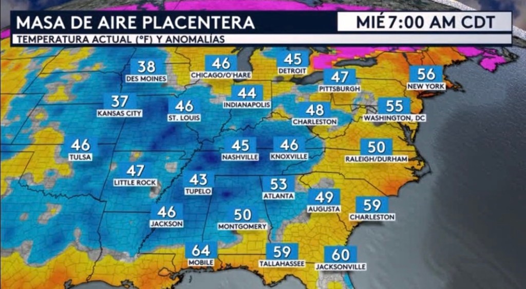 •Pero miren para mañana jueves al amanecer como las temperaturas serán aún más frías que hoy y como también se irán expandiendo al sur y este. Estas mínimas solamente serán ligeramente por debajo del promedio con una anomalía de entre 5 a 10°F, pero será una vista bienvenida especialmente dado la época del año. ¡Hasta ciudades en la costa norte de golfo como Mobile y Tallahassee van a sentir estas temperaturas frescas!