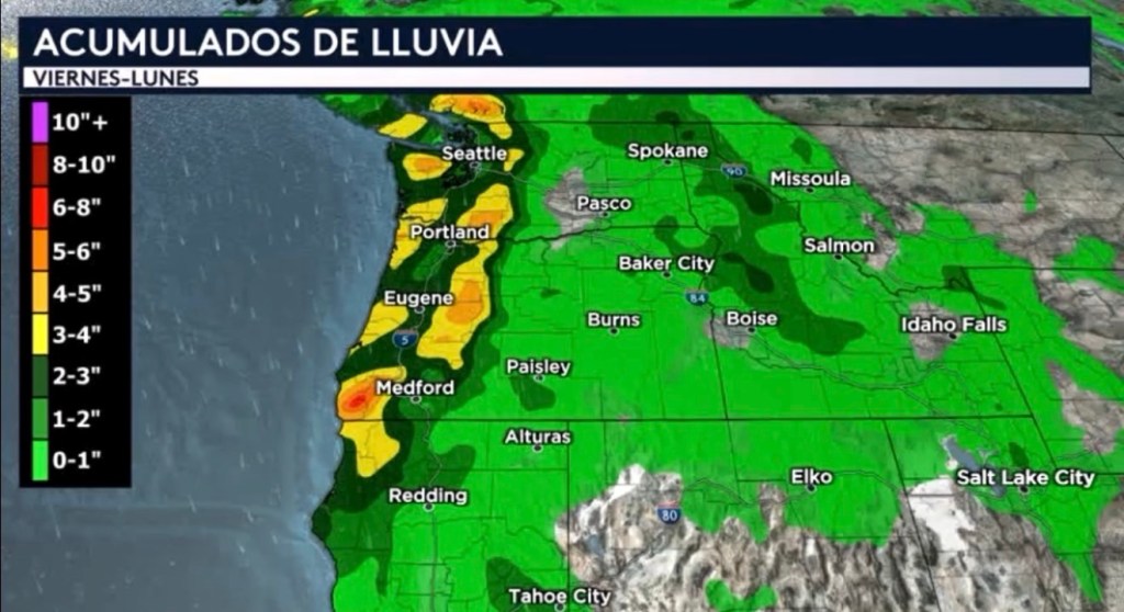•Nuestro pronóstico de lluvia nos muestra que los acumulados más altos entre de viernes y el lunes ocurrían sobre las Montañas Cascades y a lo largo de las costas del norte de California, Oregón, y Washington que incluye la interestatal 5. Es posible que viéramos acumulados generalizados de entre 2 a 4 pulgadas con totales aislados más altos alcanzando entre las 4 a 8 pulgadas.