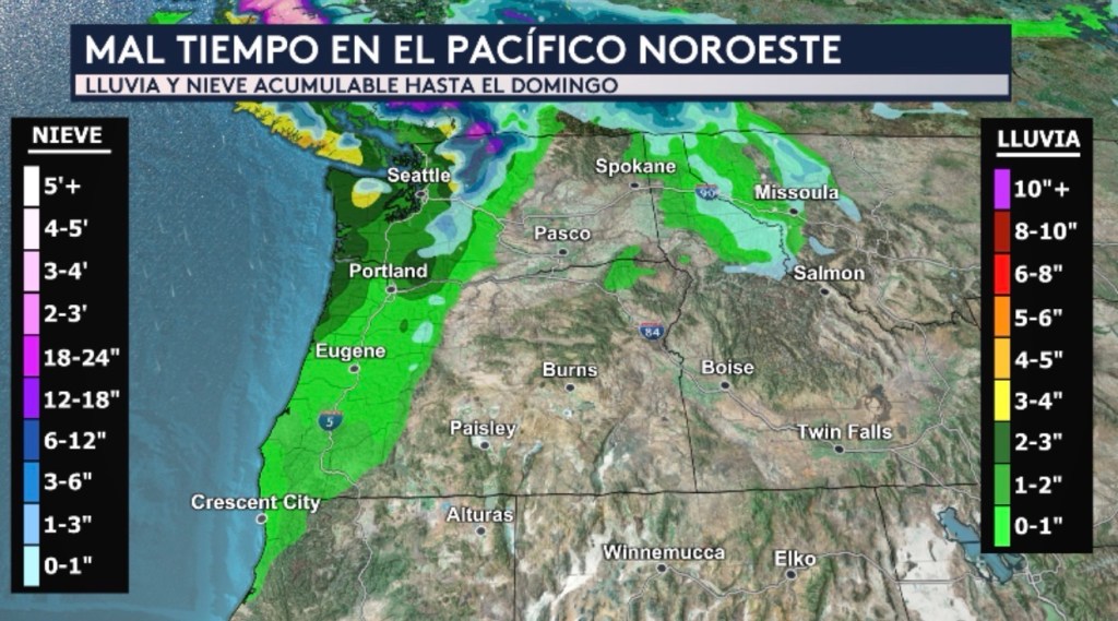 •Además de Nueva Inglaterra, otra región que también tendrá mal tiempo en el pronóstico este fin de semana es el Pacífico Noroeste, donde la vaguada de niveles altos de la atmósfera que actualmente se encuentra en el Golfo de Alaska dará paso a un río atmosférico que estará trayendo una mezcla de lluvia y nieve durante los próximos días. Estaremos hablando de acumulados de lluvia generalizados por debajo de una pulgada entre hoy y el domingo, pero en la costa de Oregón y la Península Olímpica de Washington pudiéramos ver acumulados aislados más altos de entre 2 a 4 pulgadas. Esperamos que caiga nieve en las elevaciones más altas de Montañas Cascades de Washington y al norte de las Montañas Rocosas, donde las acumulaciones en zonas aisladas pudieran alcanzar los dos pies (24 pulgadas) y las 3 pulgadas, respectivamente.