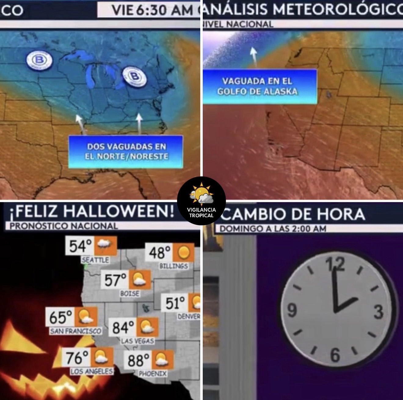 •Viendo al pronóstico nacional para este día de Halloween, si no vives en el norte de las Gran Planicies, el Medio Oeste, el interior de Nueva Inglaterra o en el Pacífico Noroeste, ¡estarás gozando de tiempo hermoso! El centro, sur y sureste del país estarán experimentando abundante sol y temperaturas placenteras que serán por debajo del promedio detrás de un frente frío. Incluye ciudades como Miami, New Orleans, Houston, Dallas y Atlanta. El oeste del país que incluye ciudades como Las Vegas, Phoenix y Los Ángeles también tendrán tiempo maravilloso con temperaturas que serán ligeramente más cálidas de lo normal para esta época del año. Seattle y Minneapolis serán algunas ciudades con lluvia en el pronóstico hoy, ¡entonces planifiquen su noche de truco o dulce en consecuencia!