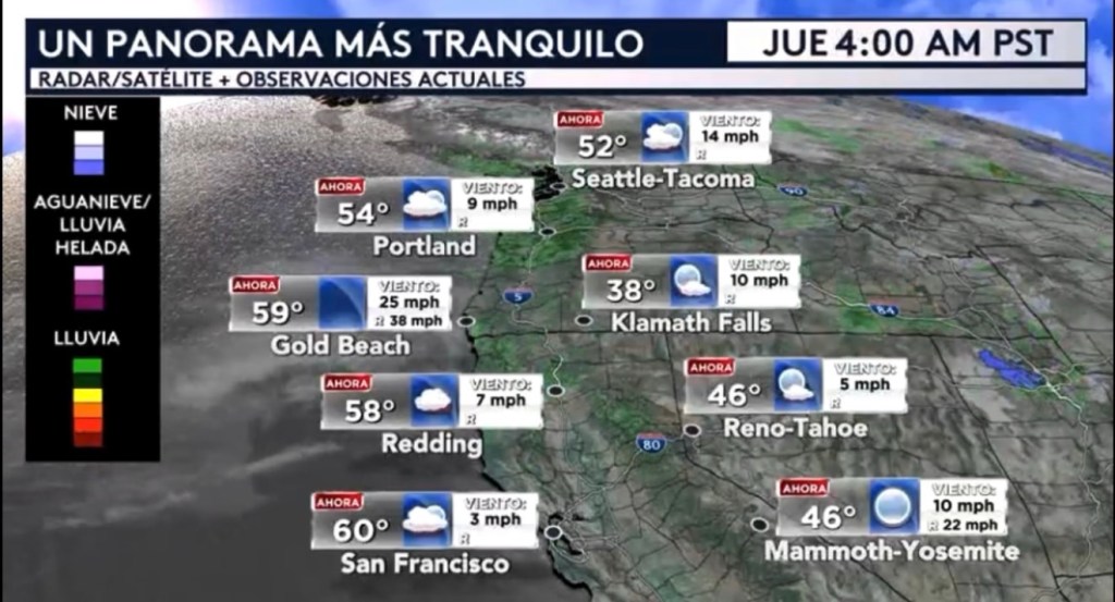 •Ningunas de las ciudades mostradas que incluye San Francisco, Reno, Portland y Seattle están actualmente reportando precipitación ni condiciones ventosas, un panorama completamente distinto y mucho más tranquilo que el de ayer. De hecho, las dos ciudades que ayer registraron las ráfagas más fuertes de la jornada, Reno y Klamath Falls, están reportando un viento ligero sin ráfagas medibles a esta hora de la mañana. San Francisco reporta un viento casi en calma a solo 3 mph cuando ayer en la mañana estaban experimentando ráfagas de entre 30 a 40 mph.
