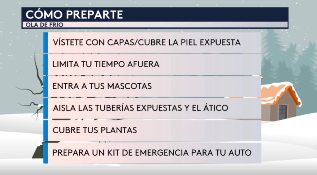 •Es importante saber cómo prepárate para una ola de frío. Ajusta tus planes para limitar tu tiempo afuera pero si lo vas hacer, vístete con varias capas de ropa y cubre la piel expuesta. Entra a las mascotas y cubre tus plantas. Prepara tu casa para el frío cubriendo las tuberías expuestas para no se congelen, y también a tu ático para evitar que el calor se escape de su hogar. Por último, debes asegurar de tener un kit de emergencia en tu auto que incluyen herramientas de asistencia en carretera y suministros de primeros auxilios en caso que te quedes varado al costado de la carretera.