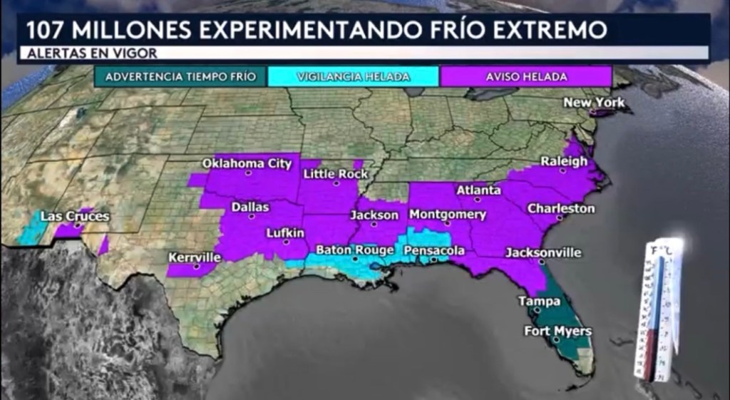 •Una ola de frío histórica e intensa está afectando a la mitad este del país para iniciar nuestra semana laboral, ya que actualmente tenemos 107 millones de personas bajo alertas por frío extremo desde Arizona hasta Connecticut. ¡Algunas de estas alertas se extienden tan al sur como hasta Fort Myers en el sur de Florida! Lugares como la ciudad de Nueva York, Raleigh, Charleston, Atlanta, Montgomery, Jackson, Little Rock, Oklahoma City, Dallas y Las Cruces están bajo un aviso por helada. Baton Rouge y Pensacola están bajo una vigilancia por helada mientras que Jacksonville, Tampa y Fort Myers se encuentran bajo una advertencia por tiempo frío.