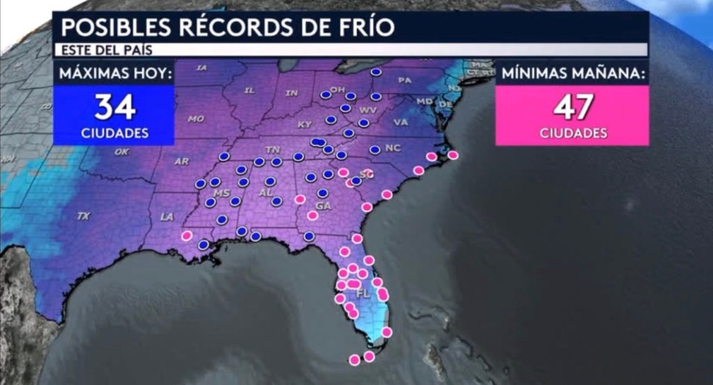 El estado que más sentirá este frío es Florida, donde pueden ver la mayor cantidad de puntos rosados en el mapa, cada uno indicando una ciudad que pudiera estar batiendo un récord de temperatura mínima mañana. Noten como estos posibles récords de frío se extienden tan al sur como hasta el punto más al sur del país: Cayó Hueso, Florida. ¡Ciudades como Cayo Hueso, Miami, Fort Myers, Tampa, Florida; Charleston, Carolina del Sur; Macon, Georgia; Knoxville, Tennessee y Jackson, Mississippi pudieran estar batiendo récords que se han mantenido vigentes durante más de 100 años! Los récords diarios de temperatura mínima de Tampa y Fort Myers se remontan a 1892 y los de Miami y Cayo Hueso a 1913. En total, más de 70 ciudades a través de la mitad este del país tendrán una buen posibilidad de romper algún tipo de récord de temperatura fría durante las próximas 24 horas.