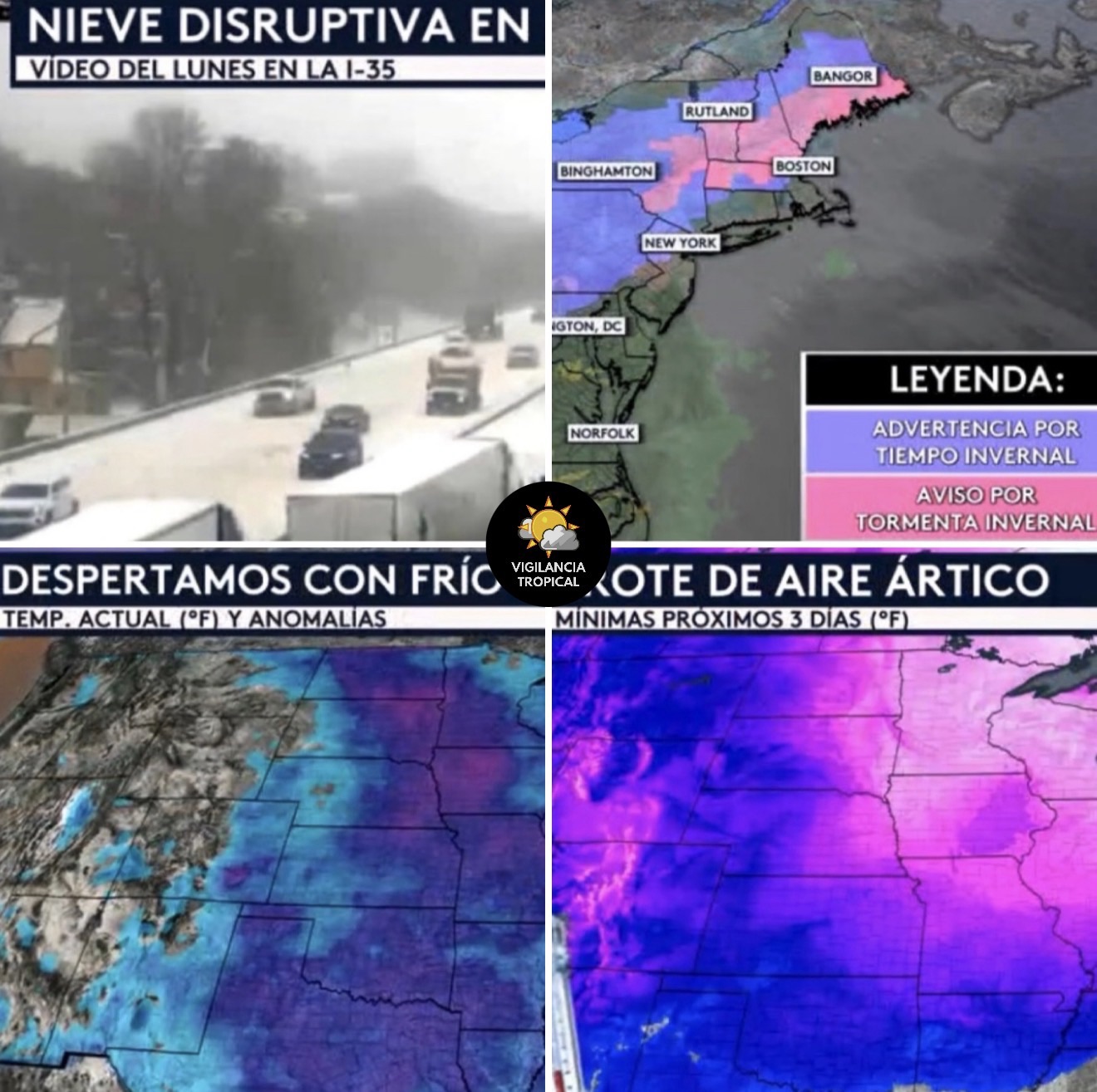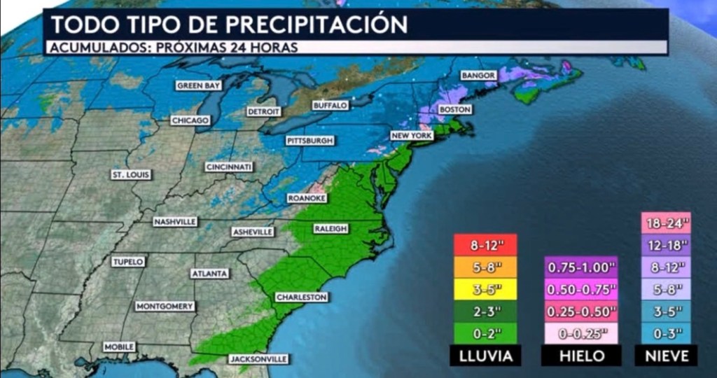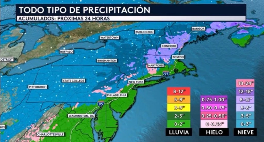 •Hay advertencias por tiempo invernal y avisos por tormenta invernal en vigor desde Kentucky hasta Maine hasta el miércoles por la mañana que incluye 15 estados y ciudades como Louisville, Columbus, Pittsburgh, Buffalo, Asheville, y Bangor.