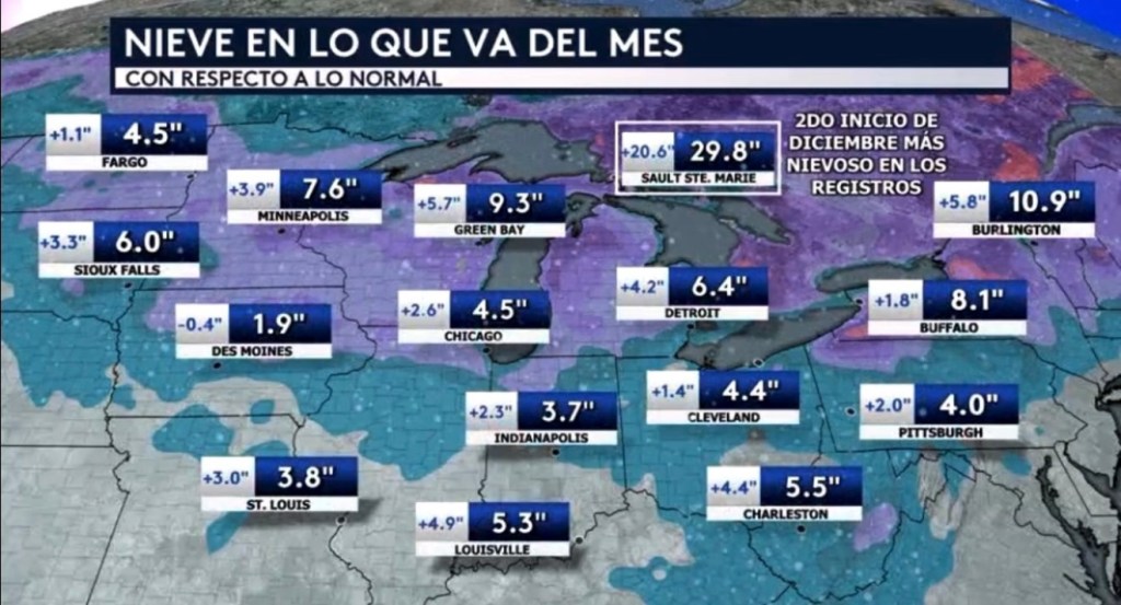 •Les echamos un vistazo a los acumulados de nieve en lo que va del mes y como se comparan al promedio. Gran parte de la región de los Grandes Lagos, el Medio Oeste, el Valle de Ohio y Nueva Inglaterra han recibido más nieve de lo normal en estos primeros 10 días de diciembre, ya que todas las ciudades mostradas menos Des Moines tienen un excedente de nieve, de hasta 6 pulgadas en algunas ubicaciones. Pero la ciudad que más destaca es Sault Ste. Marie en la Península Superior de Michigan, donde hemos observando 29.8 pulgadas de nieve acumulable mes hasta la fecha, ¡representando un excedente de 20.6” pulgadas y el segundo inicio de diciembre con mayor cantidad de nieve en los registros! Si tienen curiosidad por saber cuál fue el comienzo de diciembre con mayor cantidad de nieve en la zona de Sault Ste. Marie, ¡fue en 1995 cuando la ciudad registró la asombrosa cifra de 71.3 pulgadas de nieve durante los primeros 10 días de diciembre! Estamos a más de 40 pulgadas por debajo de ese número histórico, así que no hay necesidad de preocuparse de que alcancemos ese récord en un futuro próximo!