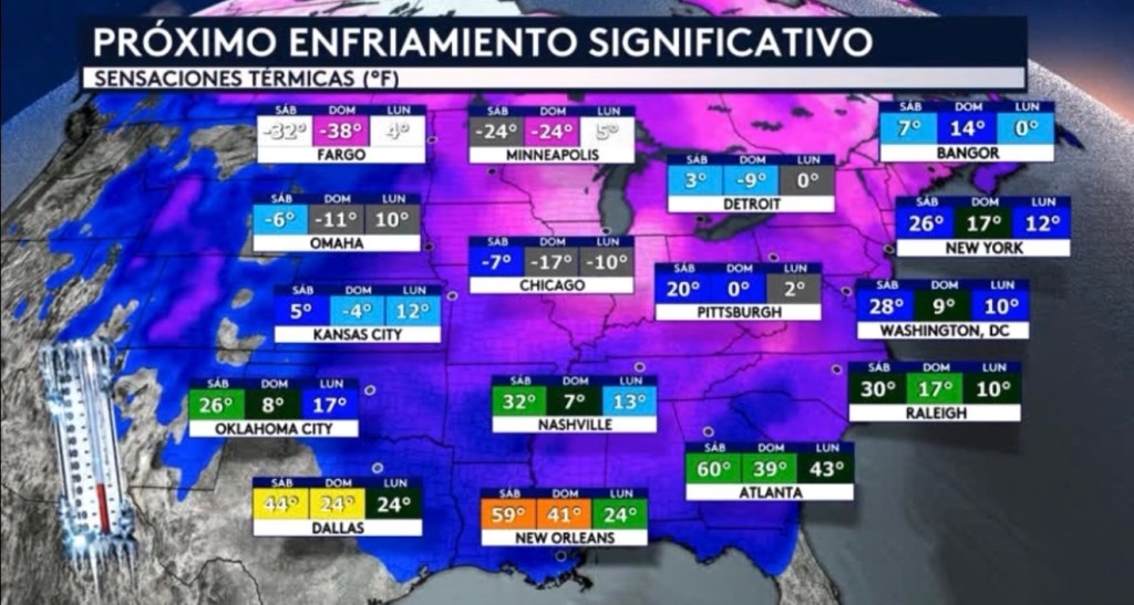•Estos son los valores que estarán marcando nuestros termómetros, pero si les agregamos el factor viento, estaremos hablando de condiciones que se sentirán mucha más frías. Las sensaciones térmicas serán extremadamente peligrosas para el nivel norte, donde ciudades como Fargo, Minneapolis, Chicago, Detroit, Omaha, y Kansas City estarán registrando sensaciones bajo cero en al menos uno, sino todos, de estos días. ¡La sensación térmica bajará a casi 40°F bajo cero en Fargo, Dakota del Norte, donde la congelación puede ocurrir en la piel expuesta en tan solo 5-10 minutos! Se sentirá como el rango de los 10°F en la ciudad de Nueva York, Washington DC y Raleigh tanto el domingo como el lunes. ¡Las sensaciones térmicas de un solo dígito se observarán tan al sur como hasta Oklahoma City y Nashville! Hasta Dallas y New Orleans se sentirán tan fríos como el medio rango de los 20°F.