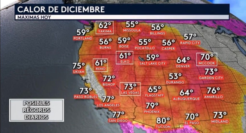 •Mientras que el este del país se prepara para esta ola de frío significativa, el oeste estará experimentando una temporada completamente diferente. Una cresta en los niveles altos de la atmósfera estará permitiendo a que las temperaturas máximas, no solo hoy sino para el resto de la semana, sean por encima del promedio para esta época del año, haciendo que muchas personas pregunten, ¿”dónde está el invierno”?! Para el día de hoy este calor de diciembre estará presente a través de la mitad oeste entera del país y se extenderá tan al este como hasta las Gran Planicies, donde ciudades como Mccook, Nebraska estará coqueando con una temperatura máxima diaria récord. Hacia la Gran Cuenca y el Pacifico Noroeste, lugares como Las Vegas, Reno y Elko, Nevada y Yakima, Washington también estarán acercándose o superando un récord diario.