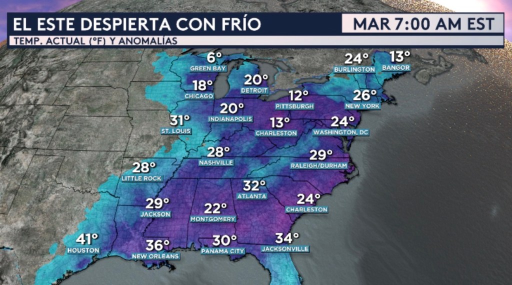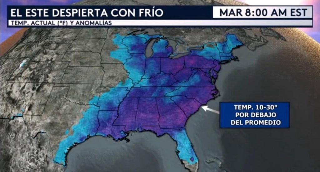 •La mitad este del país está despertando con temperaturas de entre 10 a 30°F por debajo de lo normal para esta época del año esta mañana tras el paso de nuestro fuerte frente frío este fin de semana pasado. Este frío ha llegado tan al sur como hasta el norte de la costa del golfo donde ciudades como New Orleans, Louisiana y Panama City y Jacksonville, Florida actualmente están registrando temperaturas cercanas o iguales al punto de congelación (32°F). De hecho, la mitad este entera de la nación está reportando temperaturas por debajo del punto de congelación.