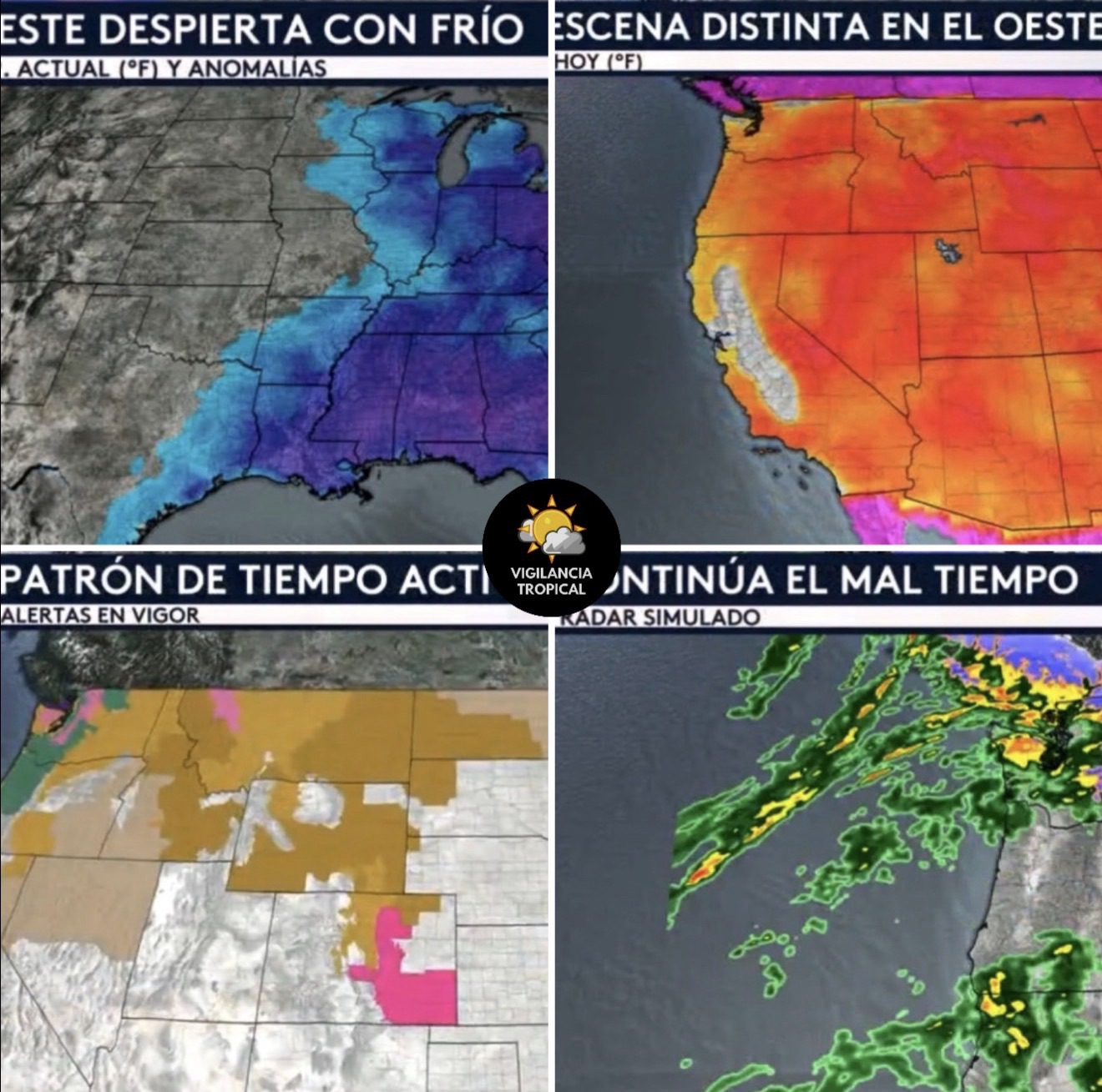 •Tenemos una escena completamente distinta en la mitad oeste del país, ¡donde no estaremos lidiando con el frío sino con un calor fuera de temporada y temperaturas que serán de entre 10 a 25°F por encima del promedio para esta época del año! No se descarta que algunos récords diarios de temperatura máxima sean batidos esta tarde.