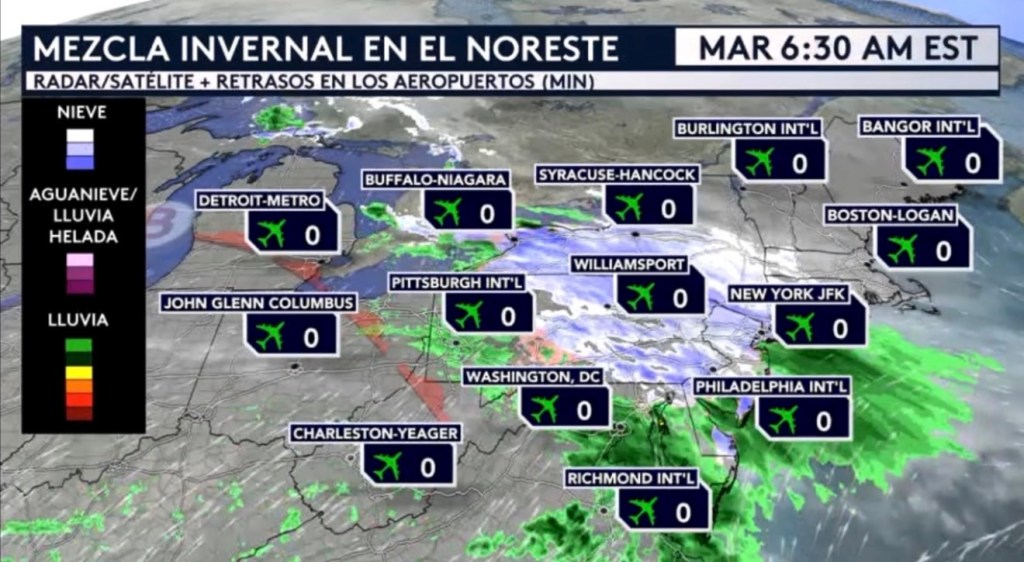 •Actualmente está nevando en la ciudad de Nueva York al igual que en Syracuse, Buffalo, y State College. Philadelphia está reportando una mezcla de lluvia y nieve y algunos gránulos de aguanieve mientras que solo se reporta lluvia en Pittsburgh, Washington DC y Richmond.
