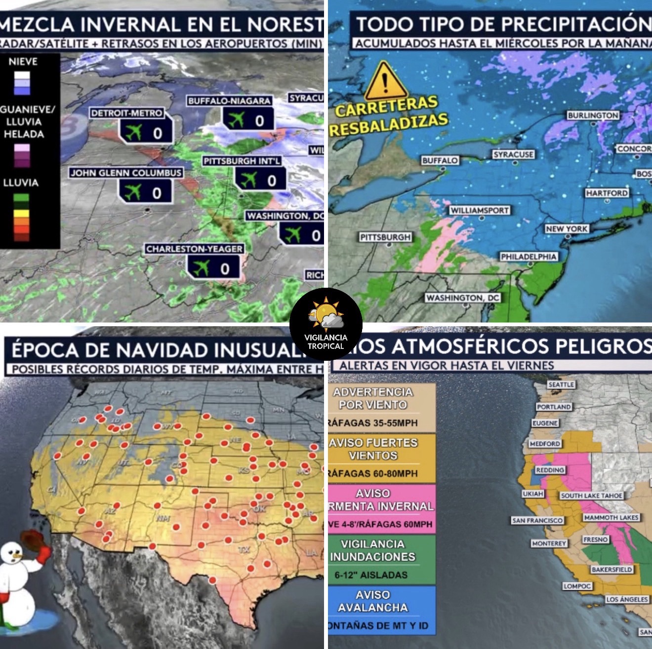 •Las condiciones del tiempo no empezarán a deteriorarse a través de la costa oeste del país sino hasta mañana miércoles con la llegada de segundo río atmosférico de la semana. Tendremos lluvias de elevación baja generalizadas, nevadas intensas de montaña y fuertes vientos abarcando la costa oeste entera desde California hasta Washington. Una vez que este río atmosférico y el sistema de baja presión asociado se desplacen hacia el norte, serán reemplazados por un tercer río atmosférico el día de Navidad, contribuyendo a la llegada de más humedad del Pacífico y manteniendo el patrón de tiempo bastante inestable a través de la costa oeste. Las buenas noticias es que ya para el fin de semana se espera un patrón de tiempo general más seco.