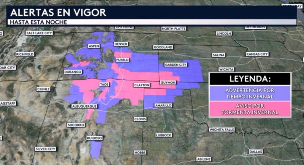 •Se mantienen en vigor tanto advertencias por tiempo invernal como avisos por tormenta invernal para partes de Colorado, Nuevo México, Kansas y los panhandles de Oklahoma y Texas hasta esta noche.