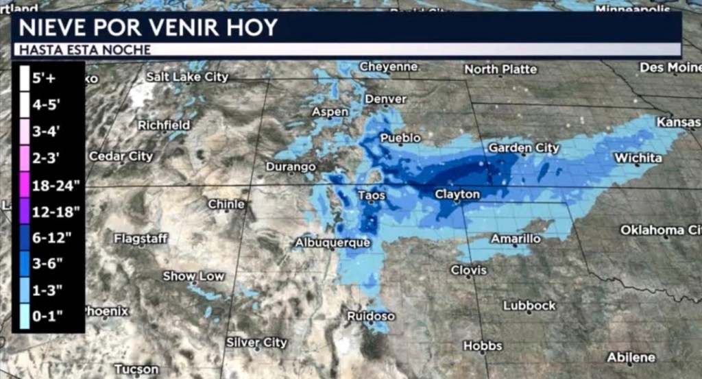 •Según nuestro modelo de pronóstico de alta resolución, todavía debemos esperar hasta un pie de nieve adicional hasta esta noche en zonas aisladas de las Montañas Sangre de Cristo y a través de las planicies del sureste de Colorado. Las acumulaciones irán disminuyendo gradualmente a medida que nos desplazamos hacia el este, con totales de entre 3 a 6 pulgadas en el oeste de Kansas alrededor del área de Garden City y solo de hasta una pulgada a medida que nos acerquemos al este de Kansas y vamos a decir al área de Topeka y Wichita.