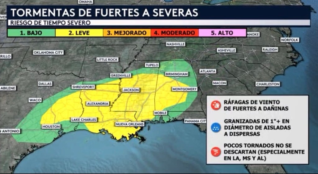 •Hoy habrá un riesgo de tiempo severo nuevamente desde Texas hasta Alabama. Hay riesgos de bajos (nivel 1 de 5) a leves (nivel 2 de 5) en vigor incluyendo ciudades como Houston, New Orleans, Jackson, Mobile, Montgomery y Birmingham. Pocos tornados no se descartan con estas tormentas, especialmente en los estados de Louisiana, Mississippi y Alabama donde tenemos un máximo local de inestabilidad. De hecho, ya hemos visto un aviso de tornado ser emitido esta mañana en Mississippi con las tormentas eléctricas en curso que vimos en radar. Granizadas de más de una pulgada en diámetro de aisladas a dispersas y ráfagas de viento de fuertes a dañinas también pudieran venir acompañadas con estas células.