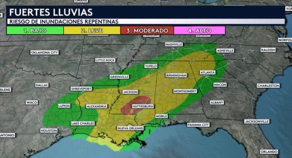 •Además del riesgo de tiempo severo, este frente frío y los aguaceros y tormentas eléctricas en curso a través del Medio-Sur supondrán un grave riesgo de inundación. Hay un riesgo bajo (nivel 1 de 4) en vigor a través de nuestro zona general desde Texas hasta Tennessee incluyendo cuidados como Shreveport, Louisiana; Tupelo, Mississippi; Mobile, Alabama; Knoxville, Tennessee y Atlanta, Georgia. El color amarillo representa un riesgo leve (nivel 2 de 4) e incluye ciudades como New Orleans, Louisiana; Jackson, Mississippi; Birmingham y Montgomery, Alabama; y Chattanooga, Tennessee. El riesgo más preocupante se encuentra en el color rojo, que representa un riesgo moderado, el segundo nivel más alto en la escala de evaluación de riesgo. Esto incluye la ciudad de Hattiesburg, Mississippi.