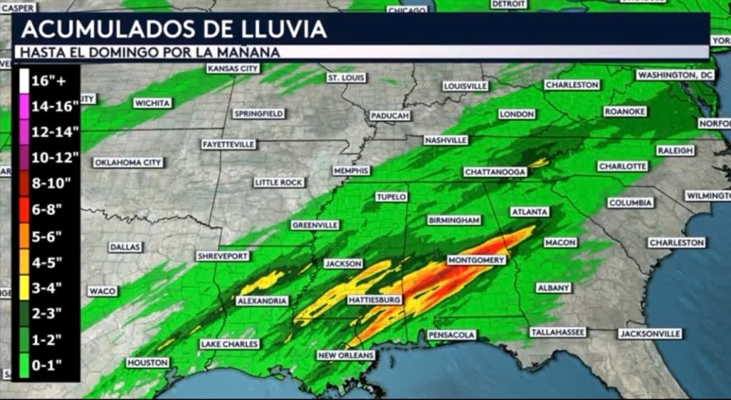 •Nuestro modelo de pronóstico de alta resolución nos muestra que tendremos acumulados de lluvia preocupantes y localmente significativos en la región Medio-Sur y partes del sureste. Habrá una extensa franja desde Louisiana hasta Georgia de acumulados de entre 3 a 5 pulgadas con totales aislados que pudieran alcanzar el rango de 8 a 10 pulgadas. El sur de los Apalaches también pudiera ver acumulados importantes, con totales aislados posiblemente alcanzando las 4 o 5 pulgadas en y en los alrededores de las Montañas Blue Ridge y Great Smoky. Este pronóstico de lluvia es válido desde hoy hasta el domingo por la mañana.