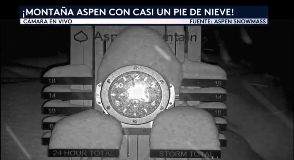 •Les echamos un vistazo a una cámara en vivo desde Montaña Aspen en Colorado cortesía de Aspen Snowmass mostrando las fuertes nevadas que se han estado registrando en las últimas 24 horas. Montaña Aspen cuenta con una configuración única que consiste en pilares distintivos que indican las mediciones oficiales de nieve y la cantidad que se ha acumulado en las últimas 24 horas. La nieve se retira de esta estación de observación cada 24 horas, o a las 4:00PM todos los días. Desde las 4:00PM de ayer, ¡se ha acumulado casi un pie de nieve en Montaña Aspen!