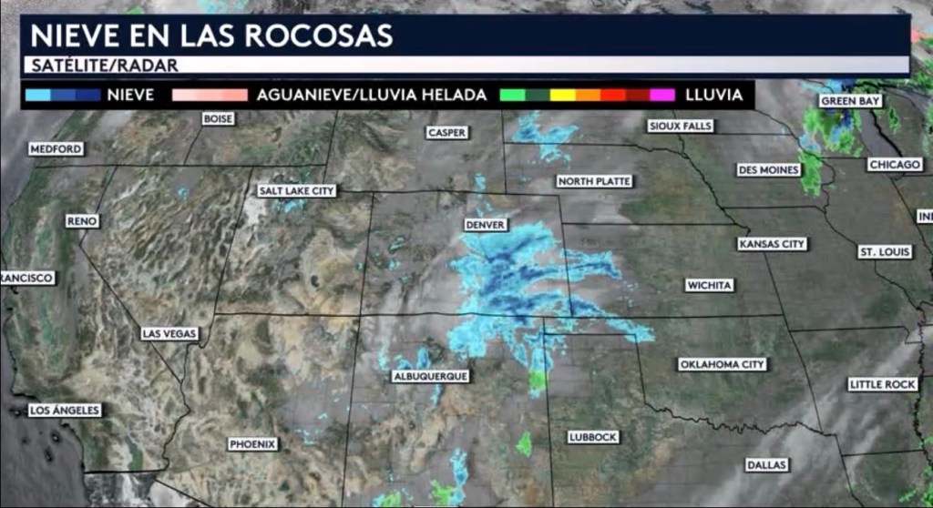 •El bucle de radar esta mañana nos muestra estas nevadas afectando a las Rocosas de Colorado y Nuevo México y comenzando a extenderse hacia las Altas Planicies adyacentes al este.