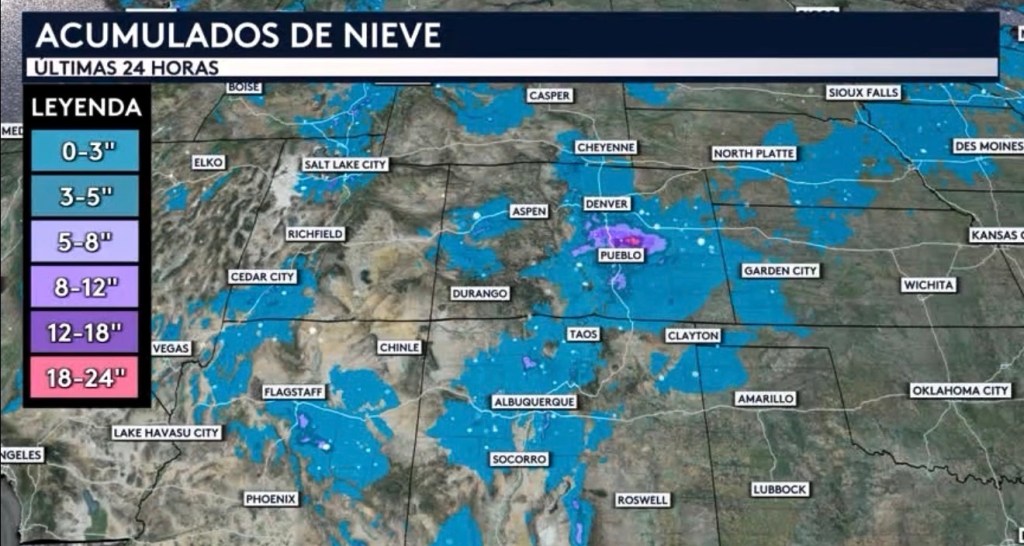•¡En las últimas 24 horas nuestro estimados de radar nos muestran que se han acumulado más de 18 pulgadas en el Palmer Divide de Colorado! En partes del oeste de Colorado, norte de Nuevo México, centro de Arizona, y justo fuera de Salt Lake City hemos visto acumulados de más de 5 pulgadas. Denver ha recibido alrededor de una pulgada en las últimas 24 horas.