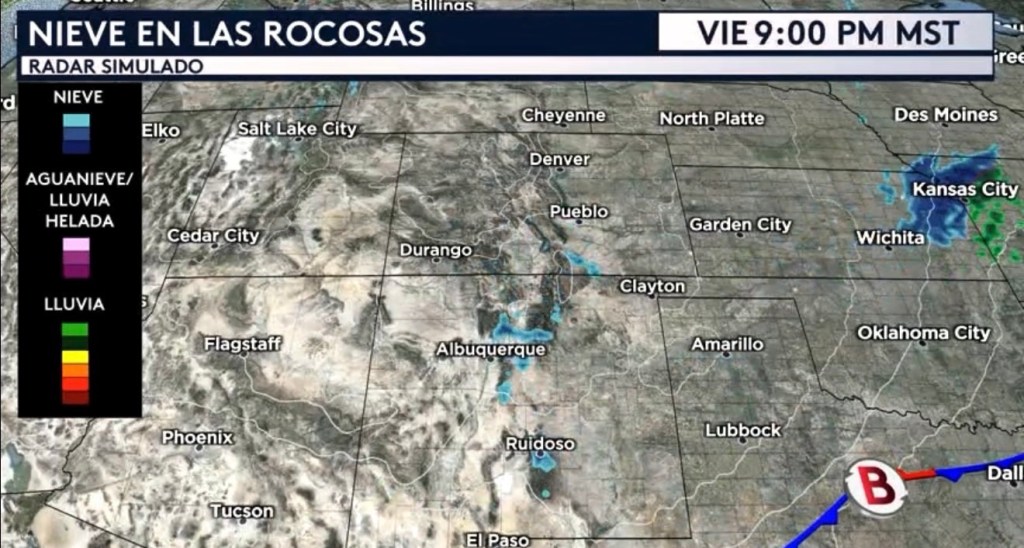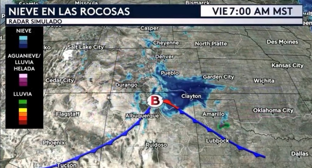 •Un área de baja presión con sus características frontales asociadas está ubicado al norte de Nuevo México esta mañana, la razón principal detrás de toda esta nieve. Se espera que este sistema frontal se aleje de las Rocosas y que se desplace al sur y este hacia los Rolling Plains de Texas luego en el día hoy, permitiendo a que el tiempo mejore para tanto Colorado como Nuevo México y que estos chubascos de nieve se muevan hacia las Gran Planicies centrales, afectando principalmente a Kansas.