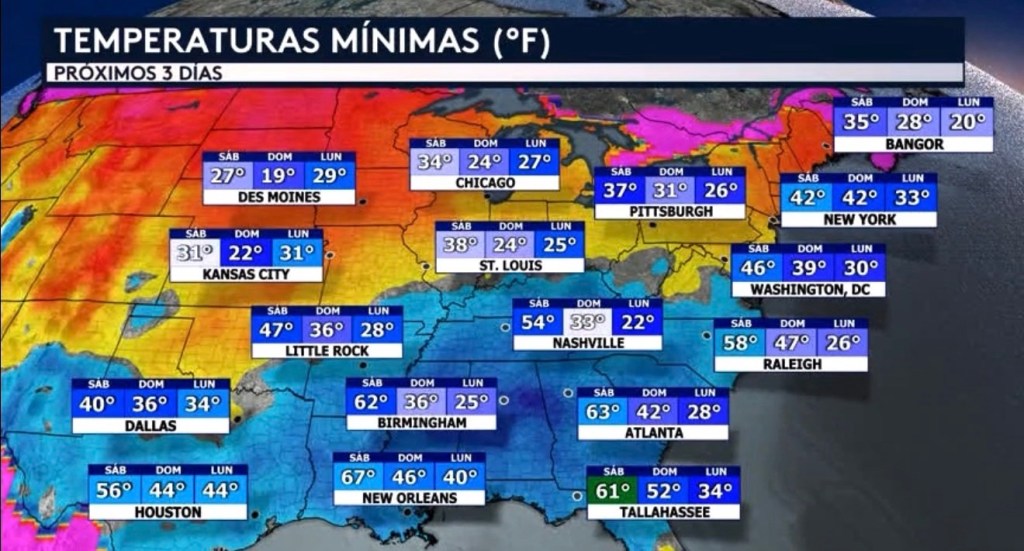 •¡Pero alivio está en camino! Un frente frío estará cruzando el este de Estados Unidos este fin de semana, permitiendo a que una masa de aire más refrescante se infiltre hacia el sur detrás de el. Todas las ciudades mostradas estarán viendo un descenso en sus temperaturas mínimas durante los próximos días tras el paso de este frente frío. Algunos lugares no solo verán un descenso en temperaturas sino un brusco cambio en ellas, bajando por más de 20°F en tan solo uno o dos días. Por ejemplo, échenle un vistazo a Birmingham donde la mínima pronosticada para mañana sábado es de 62°F, pero a partir del lunes la ciudad estará despertando con una temperatura de 25°F. ¡Esto representa un cambio de 37°F! Lugares como New Orleans, Tallahassee, Atlanta, Raleigh, Nashville y Little Rock también estarán experimentando un descenso de más de 20°F en sus temperaturas mínimas entre mañana sábado y el lunes.