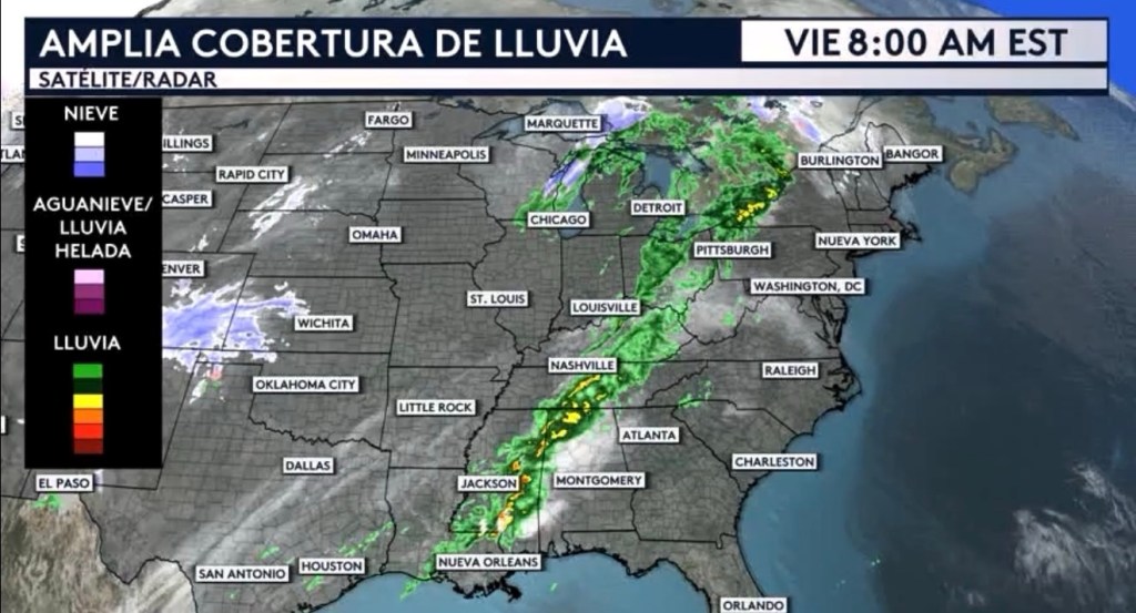 •Echándole un vistazo a nuestro radar simulado y a la progresión de este sistema meteorológico dinámico que estaremos vigilando hasta el fin de semana, podemos ver cómo hoy tendremos la presencia de fuertes lluvias a lo largo de nuestro frente frío a través del sur del país y lluvias más ligeras hacia el Atlántico Medio y noreste. Las nevadas antes mencionadas que están afectando a Colorado y Nuevo México esta mañana estarán moviéndose hacia las Gran Planicies centrales durante el resto de nuestro viernes. A partir de mañana sábado toda esta precipitación se seguirá desplazando al este con abundante cobertura de aguaceros a través de la mitad este del país. Más al norte más cerca al centro de baja presión de este sistema complejo, se espera lluvia helada en las montañas de Nueva Inglaterra y hasta condiciones de ventisca en el oeste de los Grandes Lagos empezando el sábado por la noche. Para el domingo se espera que toda la lluvia se aleje de la costa, resultando en condiciones más secas para gran parte de la mitad este del país. Lo único que estaremos vigilando serán nevadas restantes en los Apalaches centrales, a sotavento de los Lagos Erie y Ontario y en el interior de Nueva Inglaterra.