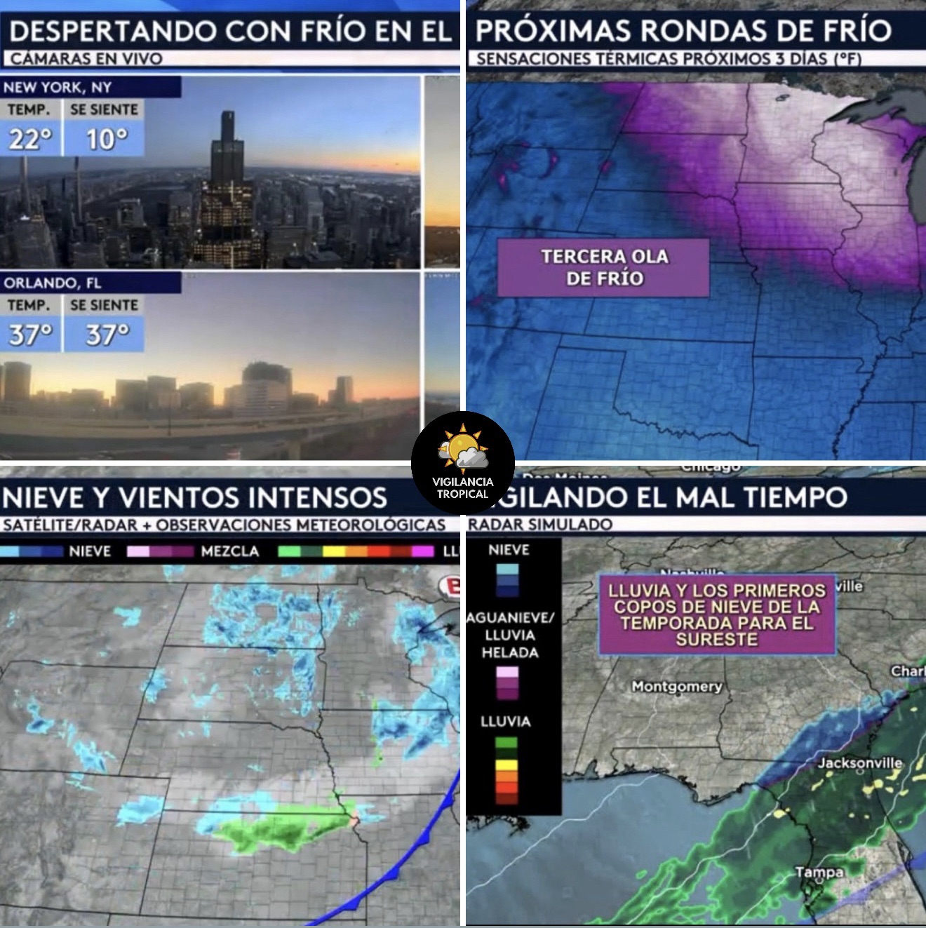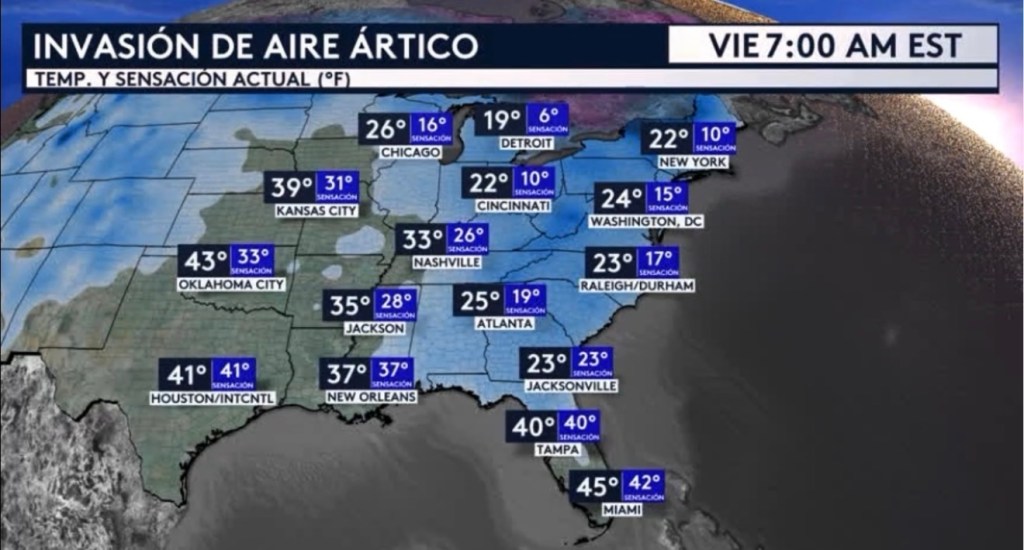 •Vemos a cuatro hermosas cámaras en vivo esta mañana desde la Ciudad de Nueva York, Washington DC, Orlando y Miami donde, como prometido, estamos sintiendo la llegada del frío extremo para comenzar nuestro viernes. La Gran Manzana está despertando con una temperatura de 22°F con el viento haciendo que se sienta como los 10°F. Washington DC reporta una temperatura de 24°F con una sensación térmica de 15°F. Incluso hasta Florida se está viendo ahora afectado por esta masa de aire ártico, ¡con Orlando despertando con una temperatura y sensación de 37°F y Miami una temperatura de 45°F con una sensación de 42°F!