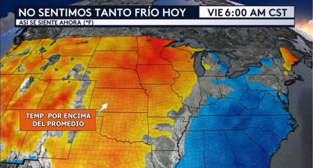 •La mitad este del país está observando esta masa de aire frío esta mañana. El frío más intenso está actualmente afectando a lugares al este de los Apalaches y Florida mientras que todos que se ubican al oeste de los Apalaches desde el Valle de Tennessee hacia las Gran Planicies y Medio Oeste no están sintiendo tanto frío como ayer. Esto se demuestra con nuestro contorno de temperatura, ya que los lugares que no se encuentran con ese color azul significa que, de hecho, están experimentado temperaturas a esta hora de la mañana que son por encima del promedio.