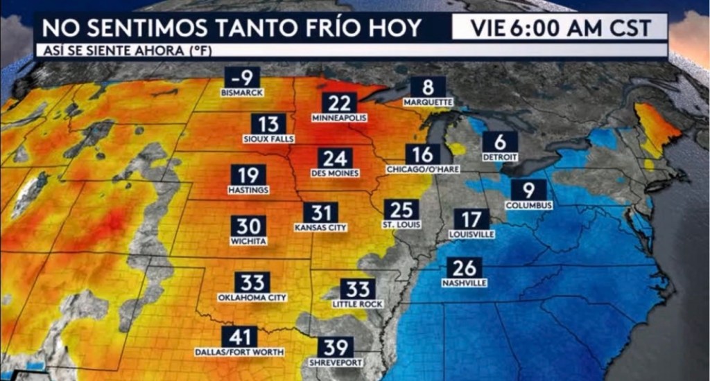 •Pero no crean que estas temperaturas cálidas van a durar, ¡ya que estamos esperando una segunda invasión de aire ártico mañana sábado y después una tercera para el lunes de la semana entrante! Ciudades en el norte de las Gran Planicies y Medio Oeste estarán experimentando sensaciones térmicas extremadamente peligrosas de entre 10 a 25°F bajo cero, ¡incluyendo Bismarck, Dakota del Norte; Minneapolis, Minnesota; Sioux Falls, Dakota del Sur; Chicago, Illinois; y Gaylord, Michigan! Las demás ciudades que están mostradas al sur y este de estas regiones también verán otro descenso en sus temperaturas este fin de semana hasta principios de la semana entrante.