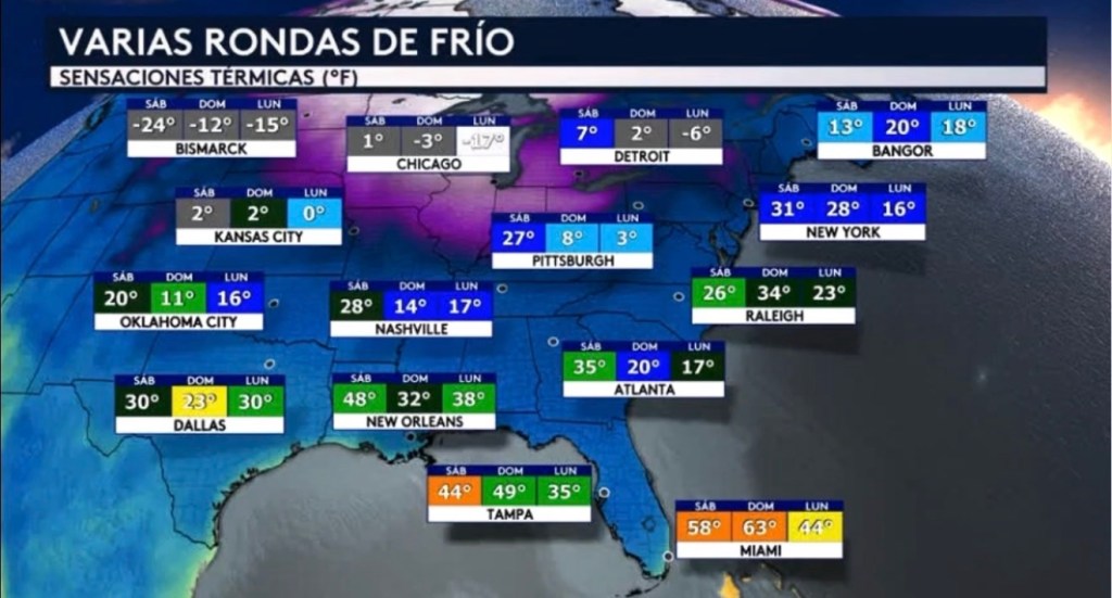 •Si observamos la situación desde una perspectiva más amplia, vemos cómo estas rondas adicionales de frío ártico estarán nuevamente llegando tan al este como hasta la costa este y tan al sur como hasta Florida. En algún punto este fin de semana, principalmente el sábado, ciudades ubicadas aquí verán un breve ascenso en las temperaturas, seguido de otro enfriamiento para la segunda mitad del fin de semana o para iniciar la próxima semana. Miami estará nuevamente despertando con una sensación térmica en el rango medio de los 40°F a partir del lunes con la llegada de esta próxima ola de frío.
