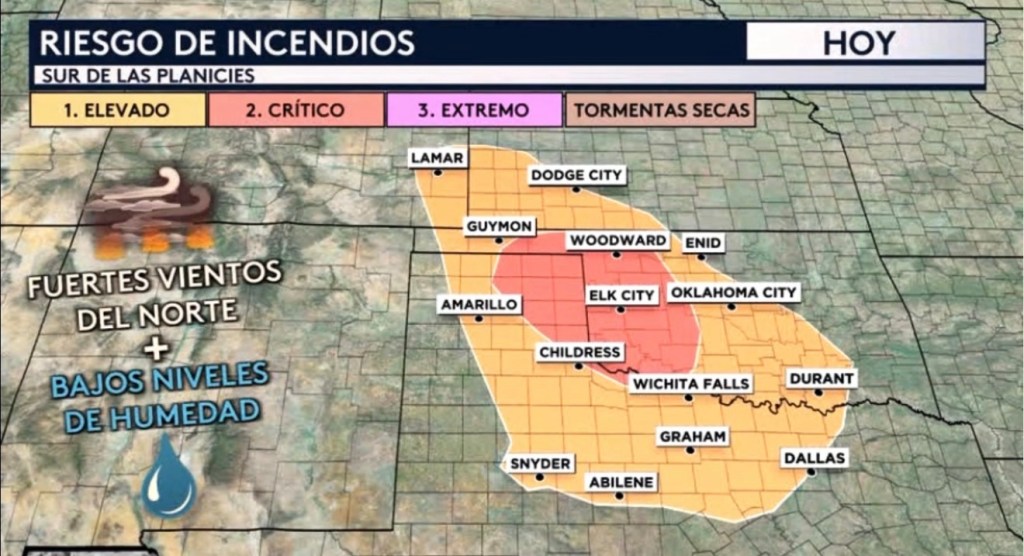 •Estos fuertes vientos, además de las condiciones secas que se encontrarán en la superficie detrás de nuestro frente frío, estarán provocando un riesgo elevado (nivel 1 de 3 en la escala de evaluación de riesgo) de tiempo de incendio a través del sur de las Gran Planicies. Incluye la zona metropolitana de Oklahoma City y otras ciudades como Dallas, Abilene y Amarillo, Texas y Dodge City, Kansas. Sin embargo, habrá una pequeña zona en el oeste de Oklahoma y el panhandle de Texas donde las condiciones serán más favorables para soportar la posible propagación rápida de cualquier incendio en curso o de uno que se inicia, donde un riesgo crítico (nivel 2 de 3) está en vigor. Esto incluye Elk City y Woodward, Oklahoma.