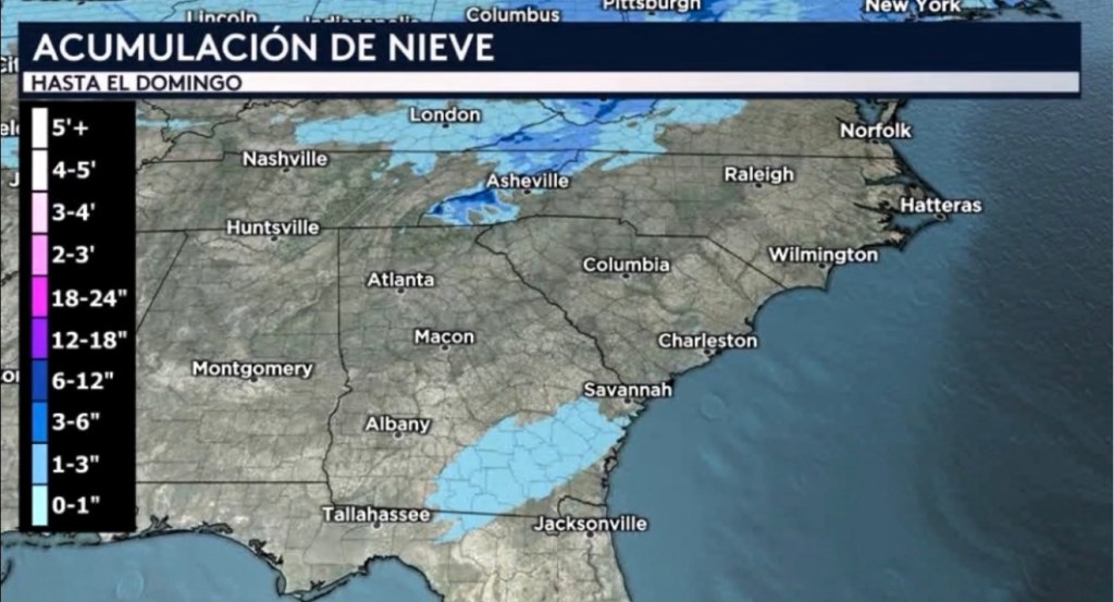 •Ha habido algunas discrepancias entre los modelos en cuanto a la ubicación exacta y la intensidad de esta nevada, pero hasta el momento nuestro pronóstico está mostrando acumulaciones que ni si quiera estarán alcanzando la una pulgada hacia el extremo norte de Florida y el sureste de Georgia. La acumulación parece adecuada, pero esta estrecha y pequeña franja de nieve podría extenderse hasta las planicies costeras de las Carolinas, algo que nuestro modelo no está mostrando pero otros si.