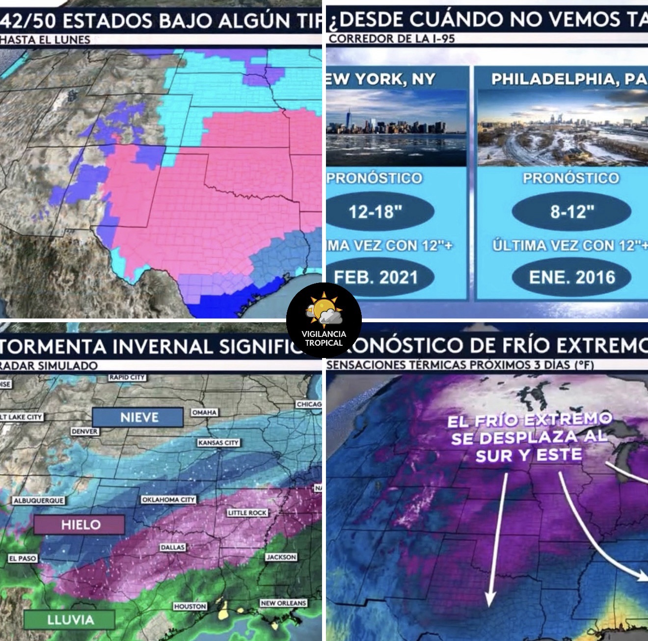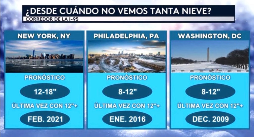 •Nuestra próxima tormenta invernal pudiera estar trayendo acumulados significativos de nieve al corredor de la I-95 que no hemos visto en más de una década en algunas de nuestras ciudades más grandes. El pronóstico actualmente indica que se pudieran acumular entre 12 a 18 pulgadas en la ciudad de Nueva York y entre 8 a 12 pulgadas en Philadelphia y Washington, DC; ¡lo que pudiera ser la primera vez que cada una de estas ciudades reciben al menos un pie de nieve en 5 años, 10 años, y 17 años, respectivamente! La última vez en la ciudad de Nueva York fue en febrero del 2021, Philadelphia en enero del 2016, y Washington DC en diciembre del 2009.