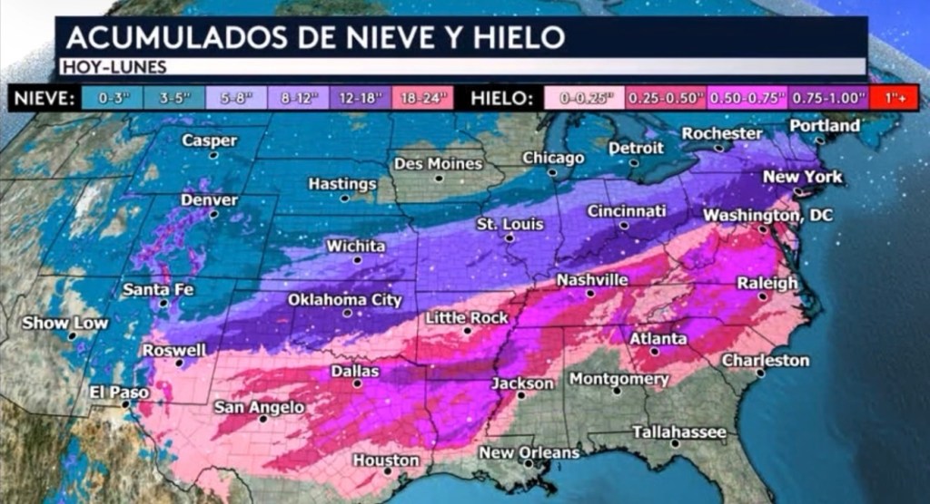 •Ahora que nos encontramos dentro del plazo de tres días del pronóstico lo cual coincide perfectamente con la aparición de nuestra tormenta invernal, podemos utilizar nuestro modelo interno de alta resolución para visualizar mejor las cantidades de precipitación acumulada mediante una resolución espacial avanzada, en lugar de la perspectiva temporal que nos proporcionarían nuestros modelos globales. Estamos esperando una franja extensiva de fuertes nevadas desde Nuevo México hasta Maine donde pudiéramos ver acumulaciones de entre 12 a 18 pulgadas y totales aislados a lo largo del camino de hasta 2 pies. Las Rocosas de Colorado y Nuevo México pudieran ver hasta 3 pies de nieve en algunas ubicaciones aisladas, ¡lo que sería extremadamente beneficioso para Colorado dado el déficit de nieve que están experimentando esta temporada de invierno! De ninguna manera vamos a restar importancia a la magnitud de estas acumulaciones de nieve, pero nuestra mayor preocupación con respecto a esta tormenta invernal reside en la acumulación de hielo. Solo un cuarto de pulgada de hielo, lo cual ya estamos previendo a través de una amplia porción del país, podría causar importantes interrupciones en el viaje debido a la capa resbaladiza que produce en las carreteras. Como si esto no fuera a tener tanto impacto como ya lo tiene, estamos pronosticando acumulaciones de hielo mucho más altos, extremadamente preocupantes y potencialmente catastróficas específicamente desde Texas hasta Virginia donde pudiéramos ver más de media pulgada. Con el peso que ejercerá esta cantidad de hielo en las líneas eléctricas y en los árboles, estaremos probablemente viendo líneas eléctricas caídos resultando en apagones generalizados y de larga duración, ramas de árboles rotas, y árboles completamente derribados. Además, todo este hielo harán que las condiciones de viaje sean prácticamente imposibles. ¿Es posible que las áreas metropolitanas de Atlanta y Houston vean hielo acumulable? Absolutamente. No creo que ciudades como Washington DC, Philadelphia y la ciudad de Nueva York vean hielo sino más bien aguanieve, que es una gran noticia para ellas.