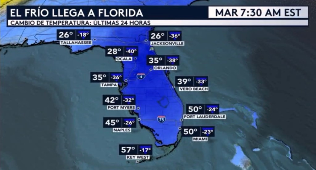 •¡Pero no crean que este calor va a durar! Vimos un fuerte frente frío pasar por la península de Florida anoche y decir que lo estamos sintiendo es quedarse corto. ¡El descenso en temperaturas es más que impresionante esta mañana donde las temperaturas que estamos registrando a través del estado del sol son de entre 20 a 40 grados más fríos de lo que hace 24 horas! El lugar que muchos en todo el país envidiaban durante esta temporada de invierno finalmente se ha sumado a las bajas temperaturas.