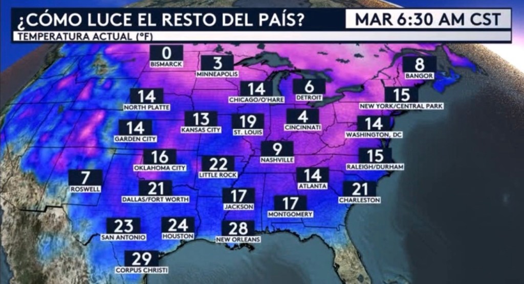 •De hecho, estamos sintiendo tanto frío en ciudades como Austin, Texas donde ya hemos batido un récord de temperatura mínima esta mañana. Se acabó de registrar una temperatura de 18°F, lo que supera el récord diario anterior de 21°F registrado en el año 2004.