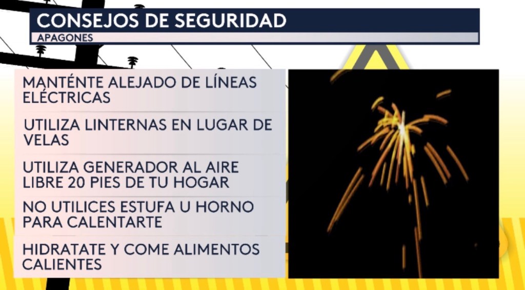•Aquí les dejo algunos consejos de seguridad de lo que hacer cuando estés en apagón. Siempre manténganse alejados de las líneas eléctricas tumbadas ya que todavía pueden estar cargados y ser peligrosos. Utilicen linternas en vez de velas y eviten usar las estufas u hornos para calentarte ya que pueden representar un riesgo significativo de incendio. Lo que también pueden hacer las estufas o los hornos es emitir gases inodoros que pueden provocar intoxicación por monóxido de carbono. Por eso es que también es importante utilizar tu generador al libre, no dentro de tu casa, al menos 20 pies de tu hogar para evitar esa intoxicación por monóxido de carbono. Por último, manténganse hidratados(as) y alimentados(as) con comidas calientes.