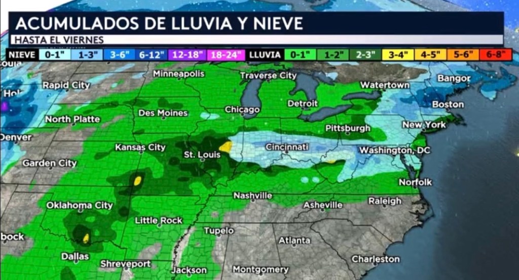 •Pudiéramos ver totales aislados de lluvia alrededor de la Región de los Ozarks y el Valle del Río Rojo de entre 3 a 4 pulgadas entre hoy y el viernes. Pero a lo largo y justamente al norte del Valle del Río Ohio es donde pudiéramos ver una franja de lluvia más fuerte donde tendremos acumulados generalizados de entre 2 a 3 pulgadas con totales aislados posiblemente alcanzado las 5 pulgadas en algunas ubicaciones. Echándole un vistazo a las nevadas, estaremos esperando acumulados relativamente ligeras a través del Valle del Río Ohio y el Atlántico Medio, pero en el norte de Nueva Inglaterra es posible que veamos algunas zonas recibir acumulados más altos de entre 6 y hasta 12 pulgadas hasta finales de semana. Acumulaciones ligeras se esperan para lugares a lo largo del corredor de la I-95 como Washington DC y Boston, con la ciudad de Nueva York recibiendo estrictamente lluvia esta semana entera.