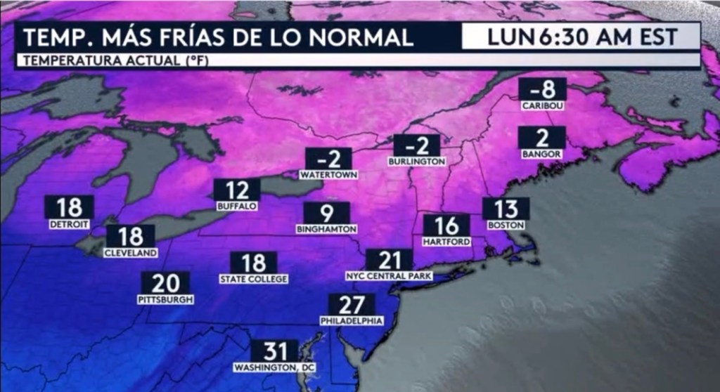 •El noreste está despertando con temperaturas más frías de lo normal para la fecha esta mañana tras el paso de un frente frío ayer. Estos valores son principalmente de entre 5 y 15 grados por debajo del promedio, pero de hasta 25 grados en algunas ubicaciones a través del interior de Nueva Inglaterra. Este frío no estará durando mucho tiempo ya que en los próximos días veremos como estas temperaturas [mínimas] se irán gradualmente recuperando.