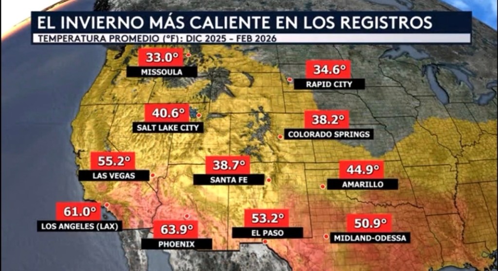•Varias estaciones del tiempo a través del oeste están despidiendo el invierno meteorológico más caliente en los registros. Ahora, muchos de ustedes probablemente están diciendo, “pero el invierno no ha acabado, ¡la primavera no oficialmente comienza hasta el 20 de marzo!” Técnicamente tienes razón, pero eso marcará el inicio de la primavera “astronómica” y no tiene nada que ver con nuestras temporadas “meteorológicas”. ¿Cuál es la diferencia? Todas nuestras temporadas astronómicas están alineadas con la órbita y la inclinación de la Tierra y comienzan ya sea en el día 20, 21, 22, o 23 de sus meses respectivos. Las temporadas “meteorológicas”, sin embargo, siempre comienzan en el primer día del mes en el que comienza esa misma temporada astronómica. Por ejemplo, la primavera astronómica, o el equinoccio de primavera, no comienza sino hasta el 20 de marzo, pero ya a partir del primer día de marzo comienza nuestra primavera meteorológica. Estas temporadas meteorológicas no tienen nada que ver con nuestros ciclos planetarios recurrentes y solo estrictamente se usan por los meteorólogos para la recopilación de datos climatológicos. Desde el 1 de diciembre hasta el 28 de febrero, ya que eso es lo que consideramos el invierno “meteorológico”, ¡ciudades como Phoenix, Los Ángeles, Las Vegas, Salt Lake City, Colorado Springs, El Paso, y Amarillo tuvieron sus inviernos más calientes en los registros!