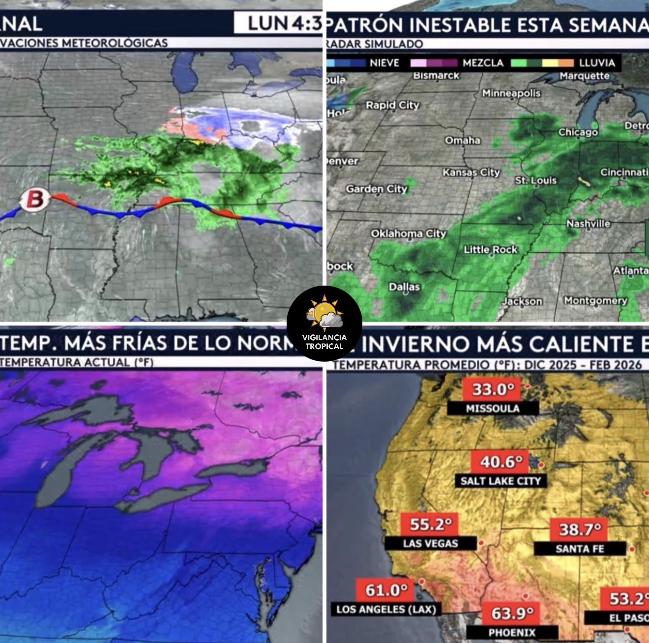 •Echándole un vistazo a nuestro radar simulado, podemos ver cómo esta mezcla invernal se irá desplazando al este a medida que avance el día, llegando a los estados del Atlántico Medio y a lugares como Washington DC, donde estamos esperando nieve esta noche. Para mañana martes veremos cómo este frente estará subiendo en latitud y trayendo una franja de lluvia desde las Planicies Centrales hasta Nueva Inglaterra. Estará lloviendo en lugares como en la ciudad de Nueva York donde no solo ahí pero en el resto del sur de Nueva Inglaterra todavía tenemos una cantidad notable de nieve en el suelo después de nuestro nor’easter. Esto será beneficioso ya que la lluvia es una, si no la mejor, de las mejores maneras en derretir cualquier capa de nieve específica. Más al interior de Nueva Inglaterra principalmente hacia tierra adentro del corredor de la I-95 veremos una mezcla de nieve y lluvia helada. Continuando a adelantar a nuestro radar hasta el jueves, veremos cómo la presencia persistente de este límite frontal seguirá produciendo tiempo inestable generalizado desde el sur de las Planicies hasta los Apalaches centrales, con el turno ahora siendo para lugares como Chicago donde estarán esperando lluvia. Para el viernes se espera otra mezcla invernal de lluvia, nieve, y esta vez aguanieve para el noreste. Sin duda será una semana activa mientras que observemos ronda tras ronda de precipitación en la mitad este del país.