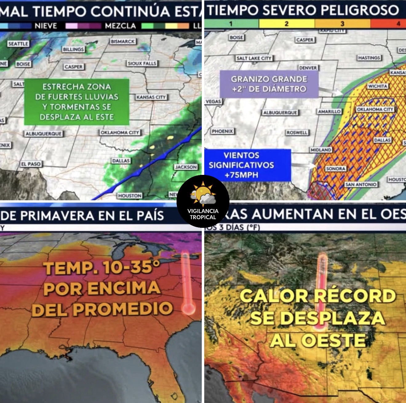 •Este calor récord se irá desplazando al oeste para la segunda mitad de la semana donde estaremos viendo como las temperaturas subirán rápidamente a niveles muy atípicos para esta época del año. Échenle un vistazo a Los Ángeles, ¡donde se pronostican que las máximas estén superando los 90 grados para el jueves y el viernes! Phoenix estará alcanzando el medio rango de los 90°F para terminar la semana laboral. ¡Noten este drástico ascenso en las temperaturas en Midland, Texas donde mañana miércoles tendrán una máxima en el medio rango de los 60°F y a partir del viernes casi llegando a los 90 grados!