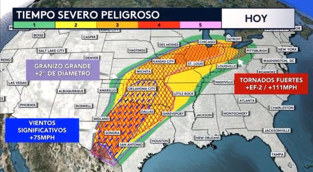 •Hoy y mañana habrán riesgos peligrosos de tiempo severo en el centro y este de Estados Unidos. Para hoy, tendremos una enorme cobertura de posibles tormentas eléctricas que pudieran volverse de fuertes a severas, con el riesgo extendiéndose desde el Valle del Río Grande hasta el Lago Erie. Hay riesgos de nivel 1, 2 y 3 en la escala que va hasta 5 en vigor que incluye grandes centros de población como Dallas, San Antonio, Oklahoma City, Kansas City, St. Louis, Chicago, Detroit y Pittsburgh. Como antes mencionado, aparte de algunas células aisladas que estarán formándose esta tarde durante el pico de calentamiento del día en el sur de las planicies y el Medio Oeste, la primera mitad del día será mayormente tranquila. No sería hasta esta noche que las tormentas se harán más numerosas a través de nuestra zona entera de riesgo. Cizalladura ambiental excepcionalmente fuerte, hodógrafas generalizadas favorables, desestabilización de moderada a localmente fuerte (+2500 J/Kg de CAPE), y un chorro de bajo nivel que estará intensificándose notablemente después de la puesta de sol todos ayudarán al desarrollo de tormentas eléctricas supercelulares dispersas nocturnas capaces de producir tornados (algunos de ellos pudieran ser fuertes de intensidad EF-2 o mayor / +111 mph), granizo de grande a muy grande de más de 2 pulgadas de diámetro y de hasta más de 3 pulgadas (más grande que una manzana) en algunos lugares, y ráfagas de viento significativas de fuerza de huracán de más de 75 mph.